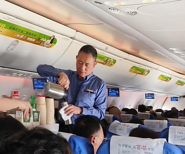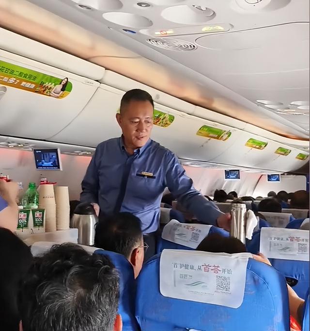 现场视频显示,一位身穿工服的空叔和一位空姐一起工作,细心地为乘客倒饮料,动作娴熟、稳重。