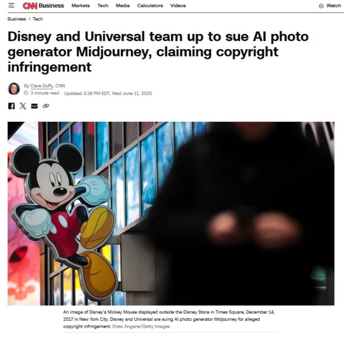 迪士尼和环球影业向加州联邦法院提交的诉状称,Midjourney存在两项侵权行为:一是利用其知识产权训练AI模型,二是生成包含知名角色的侵权图像。两家企业认为,Midjourney的行为是“无底线的抄袭”。