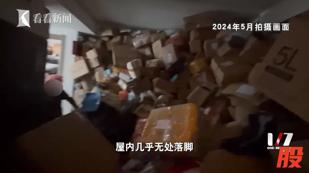 阿姨家快递堆积逼近屋顶,屋内无处落脚,她只能在快递堆里爬动。